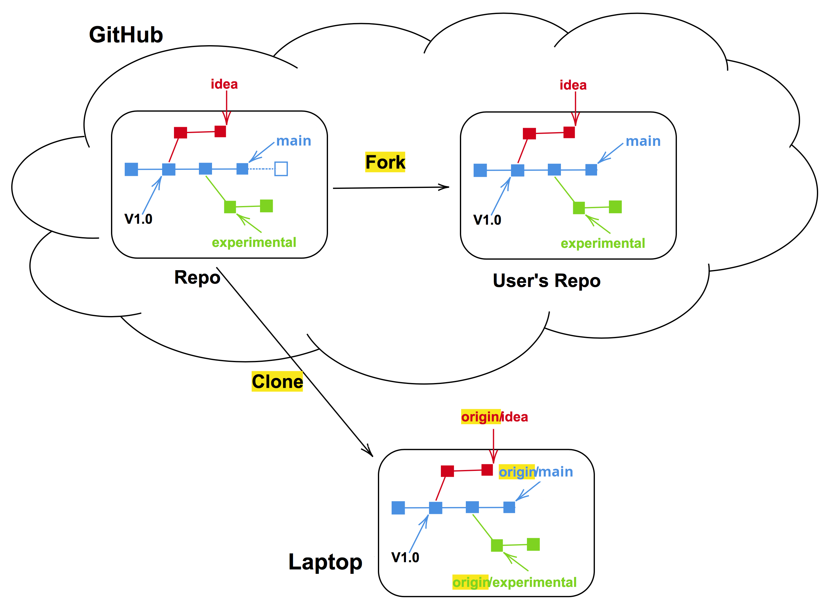 forking: Taking a copy of a repository (which is typically not yours) - your copy (fork) stays on GitHub/GitLab and you can make changes to your copy.