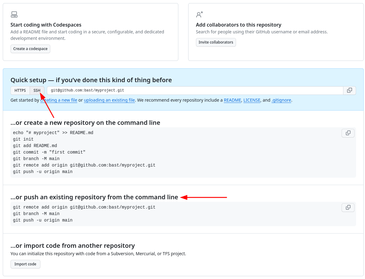 Copy paste the three lines below the red arrow to the terminal and execute those, in my case (you need to replace the “USER” part and possibly also the repository name):