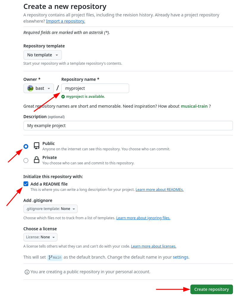 Choose a repository name, add a short description, and in this case make sure to check “Add a README file”. Finally “Create repository”.