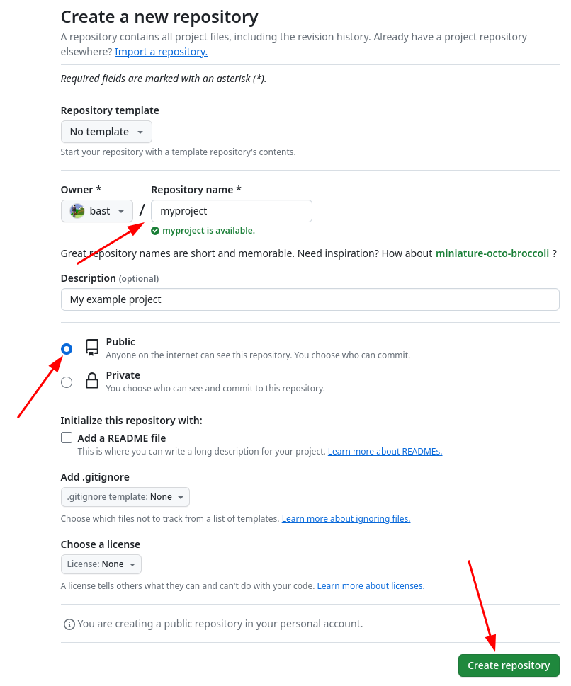 Choose a repository name, add a short description, but please do not check “Add a README file”. For “Add .gitignore” and “Choose a license” also leave as “None”. Finally “Create repository”.