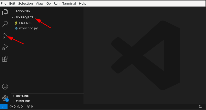 First, open the folder in VS Code. My example project here contains two files. Then click on the source control icon: